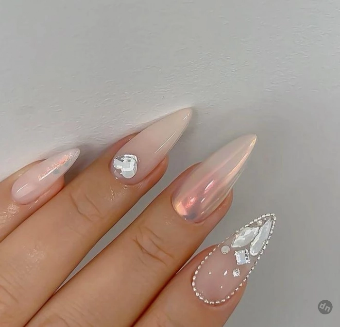 Миниатюрные кристаллы, словно капли росы, размещаются на ногтях в хаотичном порядке. Этот маникюр уместен для вечерней свадьбы, особенно в тандеме с блестящими тканями, пайетками или фатином. Эффект особенно выразителен при свете свечей или фотоспышки.