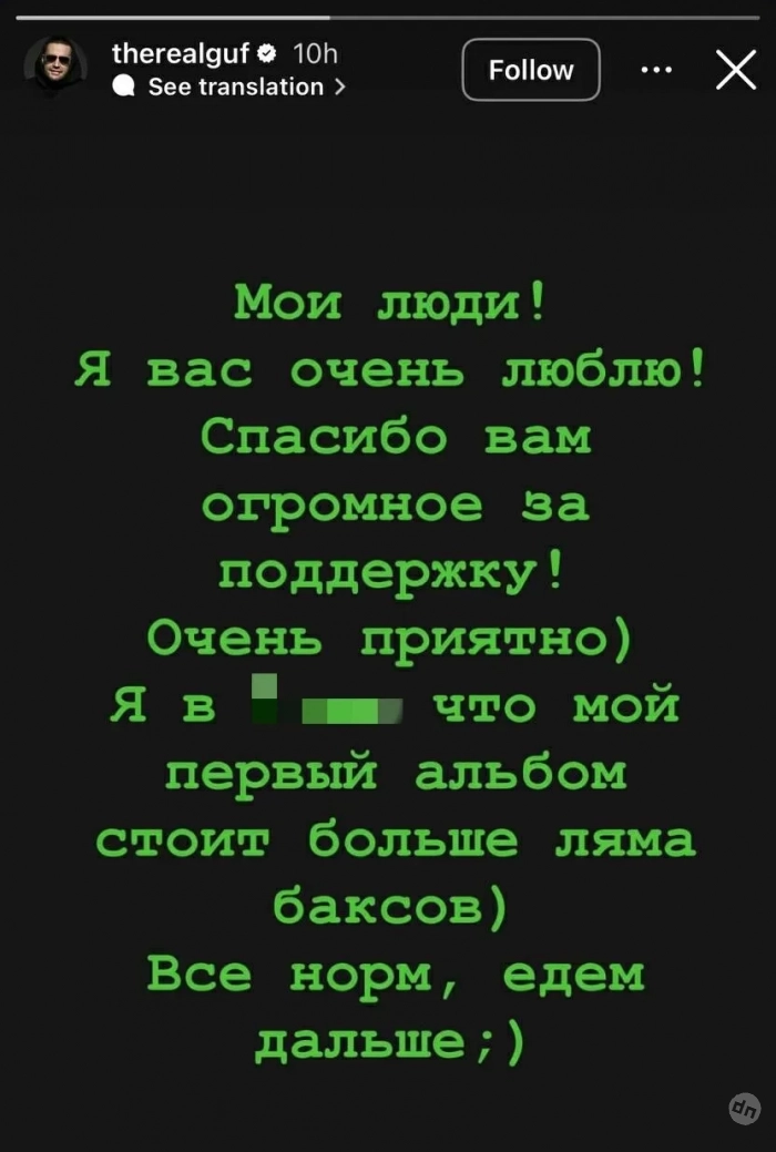 Гуф высказался о ситуации в своём инстаграме*. “Мои люди! Я вас очень люблю! Спасибо вам огромное за поддержку! Я в **** (шоке — Прим. ред.), что мой первый альбом стоит больше ляма баксов. Все норм, едем дальше”, — написал рэпер в сторис*.