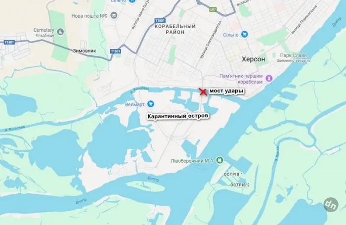 Ранее российские ВКС нанесли серию ударов авиабомбами с УМПК по автомобильному мосту, связывающему Карантинный остров с Херсоном.