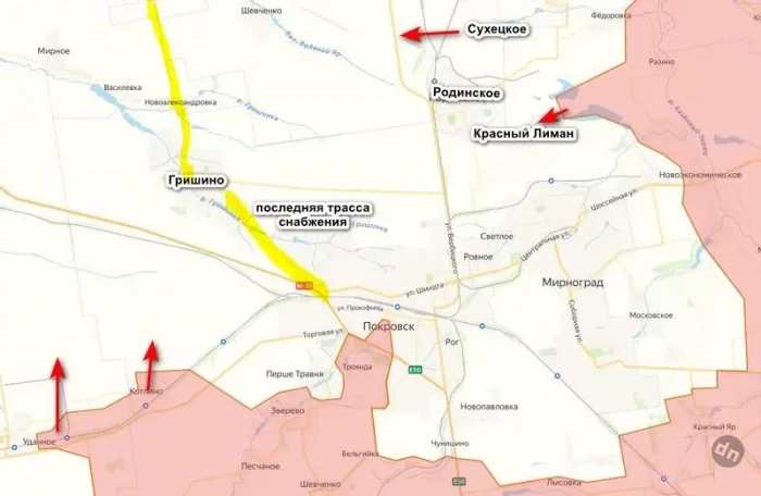 Ранее сообщалось, что наши взяли шахту «Краснолиманская» и начали бои за шахту «Родинская» у восточной окраины Родинского, пытаясь зацепиться за улицу «Шахтерской славы» и войти в город с востока. Также наши взяли Сухецкое, перерезав трассу Доброполье — Покровск, это признают и украинские ресурсы. На данный момент у противника осталась одна дорога, по которой еще можно вести снабжение, проходящая через Гришино.