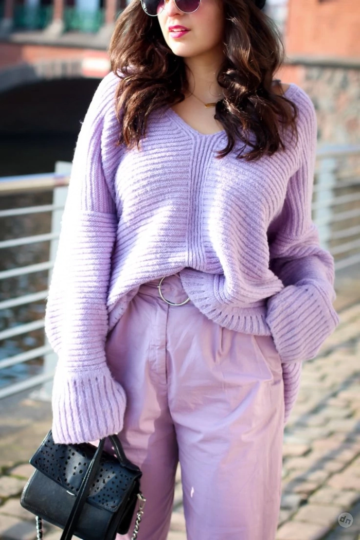 Лавандовый особенно красиво раскрывается в трикотаже, кашемире, мягкой шерсти или твиде. Эти текстуры усиливают эффект уюта и делают образ не только визуально, но и тактильно притягательным — хочется подойти ближе, почувствовать тепло.