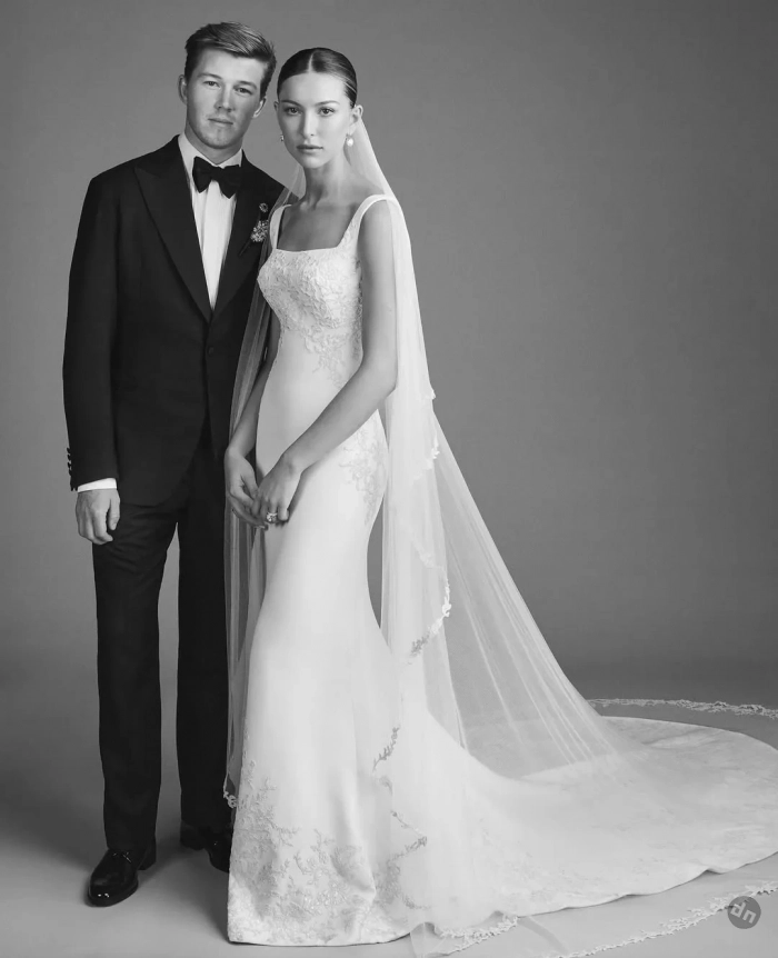 На снимке можно увидеть саму Ив в классическом белом платье невесты Givenchy и её супруга, 26-летнего спортсмена Гарри Чарльза, который в 2024 году завоевал золото Олимпиады в составе команды Великобритании в конкуре (одном из видов конного спорта).