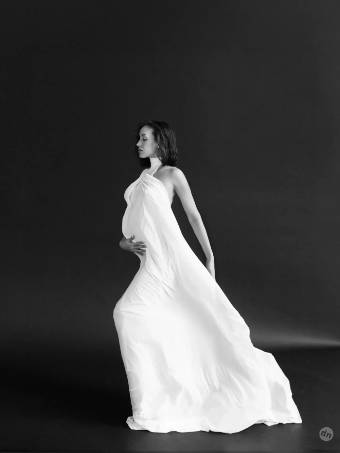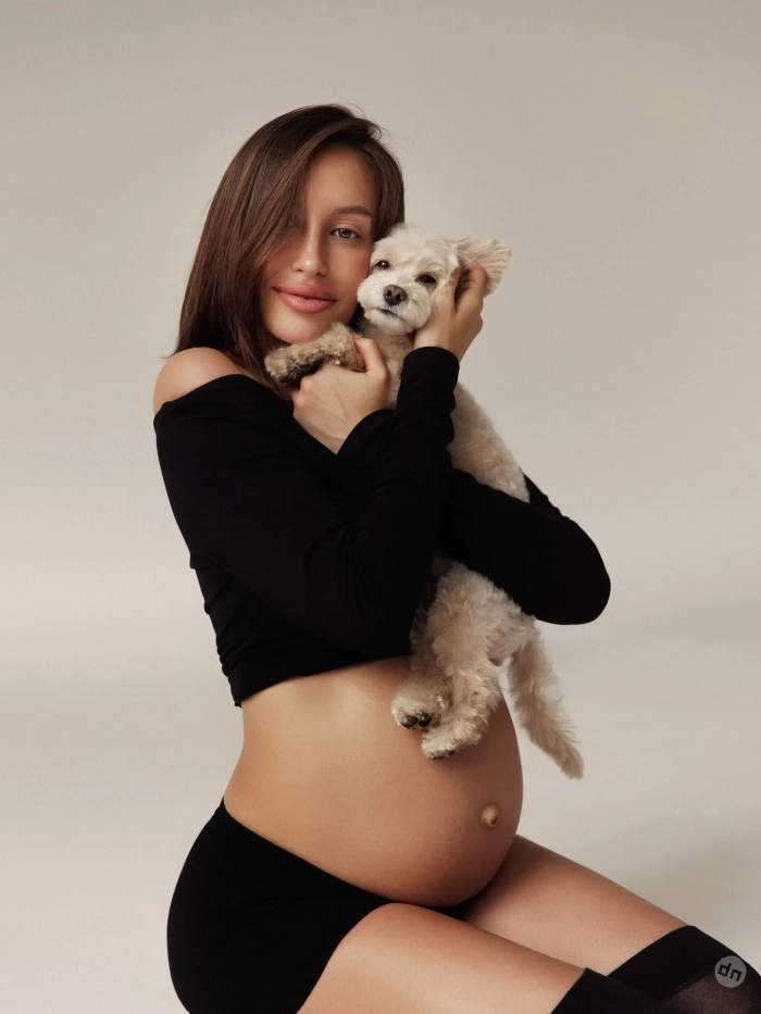 В рамках съёмки Валентина примерила несколько образов, подчёркивающих округлившийся живот: она позировала в длинной белой юбке с бюстгальтером, чёрном кроп-топе с мини-шортами и чулками, струящемся платье с высокими вырезами на бёдрах, а также топлес. На некоторых кадрах компанию ей составил любимый питомец — собака породы мальтипу по кличке Киви. "Беременность пролетает незаметно, время скоротечно, но за этот короткий промежуток в тебе появляется столько любви, ведь ничего нет лучше ощущения, чем носить под сердцем частичку себя", — подписала фото Валентина.