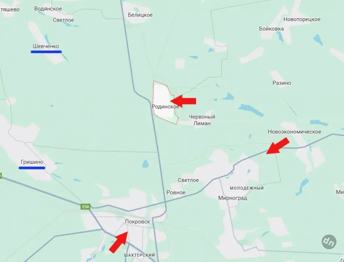 От Родинского до Гришино, которое является ключом к западному маршруту снабжения Покровского гарнизона ВСУ, около 8 км. И того меньше до упомянутого Шевченко.