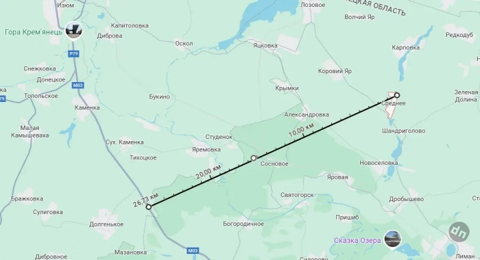 Но продвижение в районе Нитриуса - это не о только «о Красном Лимане». Есть там и стратегическое направление - в сторону автомобильной дороги М03, которая соединяет Харьков и Изюм со Славянско-Краматорской агломерацией. При учёте того, что ВС РФ перерезали кратчайший путь из Покровска в Краматорск и Славянск, взятие указанного на карте участка дороги М03 как минимум под огневой контроль может привести к тяжелейшим последствиям для гарнизонов врага в этих городах. На данный момент до автодороги с северо-востока - 26-27 км. То есть, для обычной артиллерии - вполне подходящая дистанция.