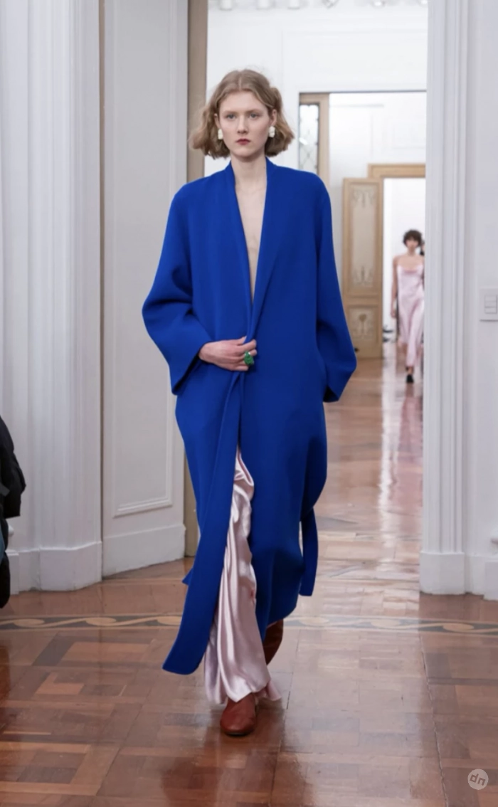 Alberta Ferretti показали, как легко можно сочетать два главных оттенка осени — йогуртово-розовый и электрический синий. Розовое шелковое платье и синий акцент стали идеальным дуэтом: романтичный, но с характером. Такой образ подойдет для вечерних выходов или ярких городских мероприятий, где важно выделиться.