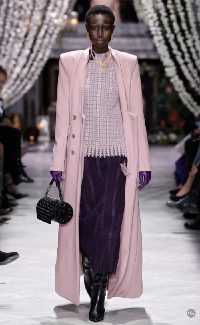 У бренда Bibhu Mohapatra йогуртово-розовый встречается в длинном кашемировом пальто. Но особенно эффектно он смотрится в дуэте с баклажановым — насыщенным фиолетовым оттенком. Это сочетание делает образ дорогим и утонченным, подчеркивая индивидуальность. А дополняющие его аксессуары — например, цветные перчатки — подчеркивают тренд на яркие детали, который сохранится с весны 2025 и в осеннем сезоне.