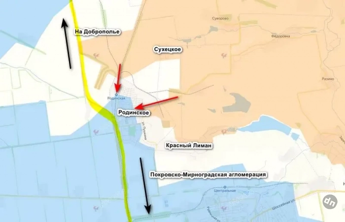 Как ранее сообщалось, небольшой город Родинское расположен к северу от Покровско-Мирноградской агломерации, через него проходит трасса, соединяющая Покровск с Добропольем. Ее уже перерезали выше Родинского, теперь берут под контроль и город.