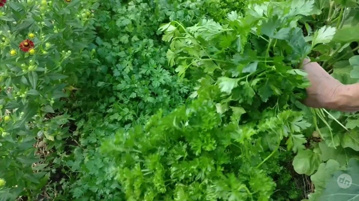 - Кинза, укроп, петрушка — ароматные травы, которые обогатят рацион витаминами, улучшат пищеварение и придадут блюдам свежий вкус. Петрушку можно посеять густо — часть листьев снимите сейчас, а остальные оставьте для зимовки.
