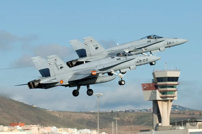 Пара F/A-18A+ из 46-го авиакрыла ВВС Испании взлетают с авиабазы Гандо , Гран-Канария , в феврале 2008 года
