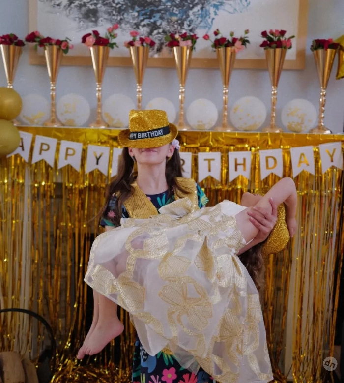 Перед гостями Узерли появилась в платье, имитирующем жидкое золото, в таком же стиле был украшен её дом. Гости праздника, среди которых были её родители, старшая сестра и двое детей, также были в нарядах с золотистыми пайетками.