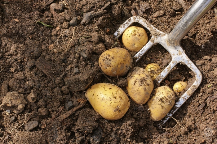 - Если почва сильно пересохла, можно применять вилы с 4–5 плоскими зубцами. Однако минус в том, что проткнутые вилой клубни уже не подходят для длительного хранения и их лучше использовать сразу.