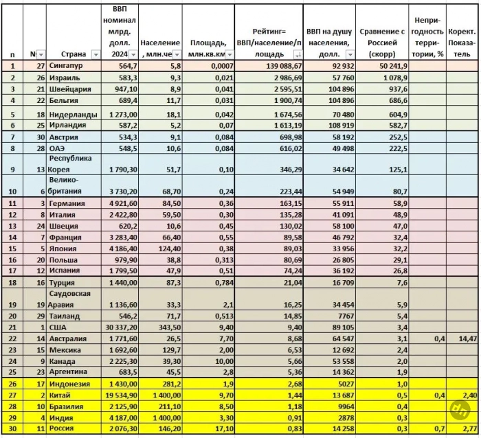 Попробуем сделать расчеты по предложенной модели, взяв за основу страны из ТОП-30 мирового ВВП. Результаты по показателю эффективности — ВВП/население/площадь — оказываются крайне интересными.