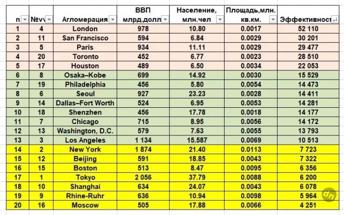 В первой колонке место городов по ВВП (номинал). Москва явно не вторая, а только 16-я. Получаются крайне интересные данные. Самая большая городская экономика мира – Токио – 2 трлн. долл., Нью-Йорк – 1.8 трлн. долл. Но если смотреть по эффективности, безусловным лидером стал Лондон с рейтингом 52 тыс., потом Сан-Франциско – 30 тыс., далее – Париж – 29 тыс. Но если отнести Сингапур в категорию городов, он и здесь будет на первом месте с показателем 139 тыс. А Нью-Йорк, занимая по ВВП второе место, поднялся в рейтинге лишь немногим выше Москвы – 14. Здесь Москва по эффективности использования ресурсов находится на последней строчке, уступая лидерам (Лондон и Сан-Франциско) в 7-10 раз.