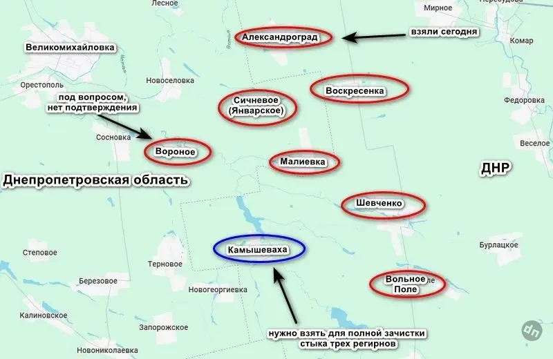 После освобождения Александрограда под контролем ВСУ на стыке трех регионов остается только Камышеваха. Ее взятие поставит точку на освобождении этого угла в ДНР, дальше только Запорожская и Днепропетровская области.