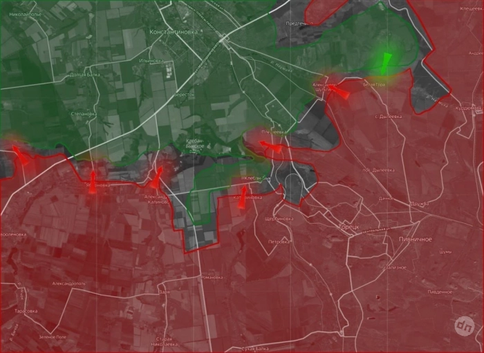 На Константиновском направлении ВС РФ стараются продвинуться севернее Полтавки в сторону Софиевки. В районе Торецка противник контратакует у Щербиновки, пытаясь вернуть позиции на окраинах. В Катериновке и Клебан-Быке идут интенсивные сражения. Наши продолжают атаки в районе Александро-Шультино, а в районе Часов Яра ВС РФ продвигаются у Николаевки.