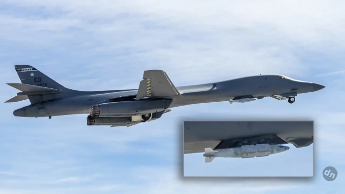 Крупный план авиабомбы, которая, по-видимому, является УАБ GBU-72/B, подвешенной на пилоне самолёта B-1B. На вставках показаны различия между авиабомбами GBU-72 и GBU-31v3