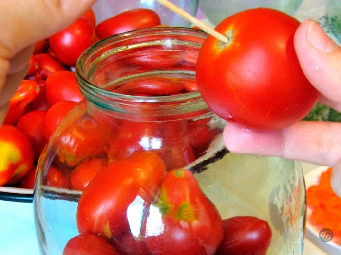 Аккуратные проколы. Легко проколите зубочисткой кожицу рядом с плодоножкой. Это позволит горячему маринаду проникнуть внутрь плода и снизит риск трещин.