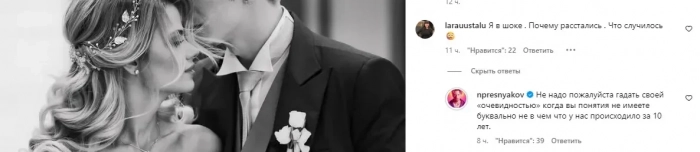"Я в шоке. Почему расстались? Что случилось?", "Она: красивая, молодая, с хорошим аппетитом на жизнь, увидеть мир, взять из этих отношений максимум плюшек, играя роль. Что хотела, то получила. Он: не ахти, но известный, богатый. Поверил в её театральную любовь! Вывод: абсолютно разные люди и даже не смотрятся вместе", "Если за 10 лет семья не выросла хотя бы до трёх человек, в ней становится очень пусто и грустно", — пишут они.