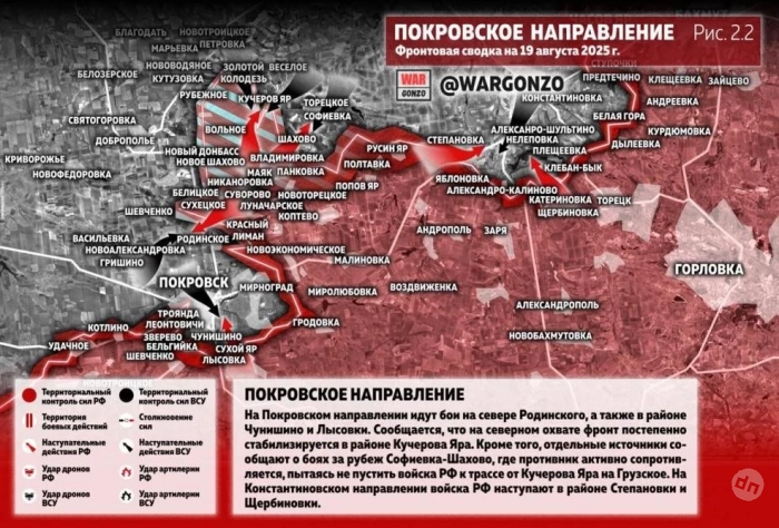 На Покровском направлении ВСУ перебрасывают резервы в район Нового Донбасса и Золотого Колодезя. В Родинском идут интенсивные боестолкновения на севере населенного пункта и его юго-восточной окраине. Российские войска усиливают давление на Чунишино и Лысовку. ВС РФ давят ВСУ в северной и восточной частях Леонтовичей, идут бои в Удачном.