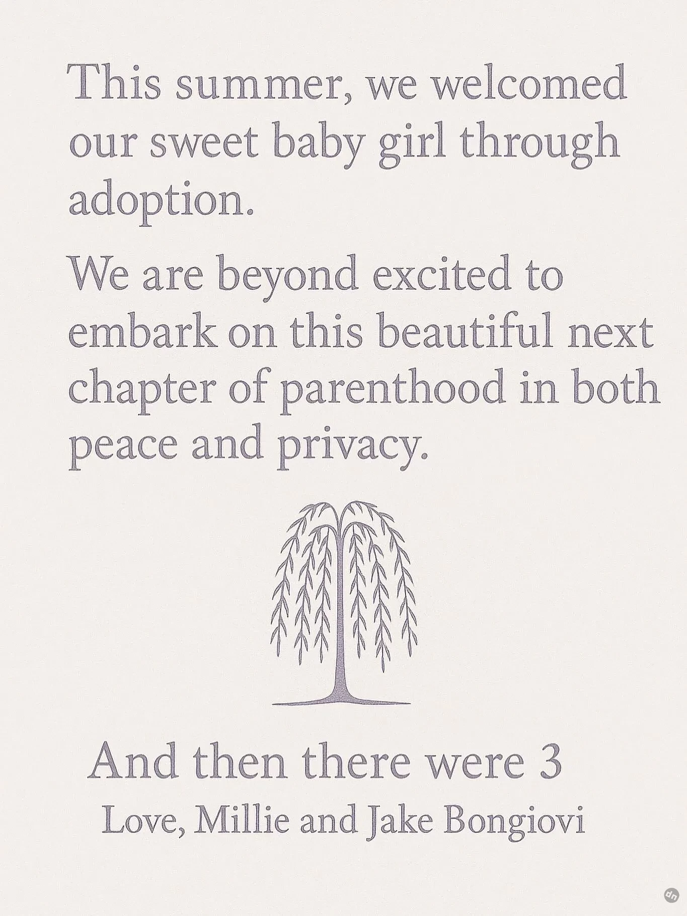 "Этим летом в нашу семью пришло счастье — мы усыновили чудесную девочку. С огромным трепетом начинаем новый этап родительства, полный уюта и гармонии", — гласит подпись на картинке, где изображена ива. В публикации пара также отметила: "И вот нас уже трое". При этом Милли не уточнила, когда именно это произошло, и предпочла не раскрывать имя ребёнка.