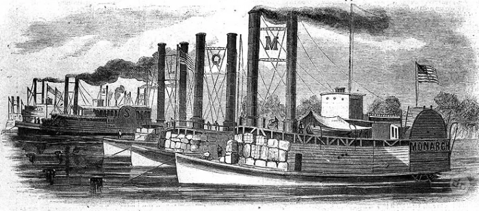«Таранный флот полковника Эллета на Миссисипи». На переднем плане изображены корабли: «Монарх» (буква «М» между трубами), «Королева Запада» (с буквой «К») и «Львица» (буква «Л»). На левом заднем плане видны: «Швейцария» (с буквой «Ш» на гребном колесе), «Самсон» и «Ланкастер». Обратите внимание на тюки хлопка, сложенные на палубе для защиты котлов. Гравюра по рисунку Александра Симплота, опубликованная в журнале «Харперс Уикли» в 1862 году. — Фотография № NH 59007 в Военно-морском историческом центре США.