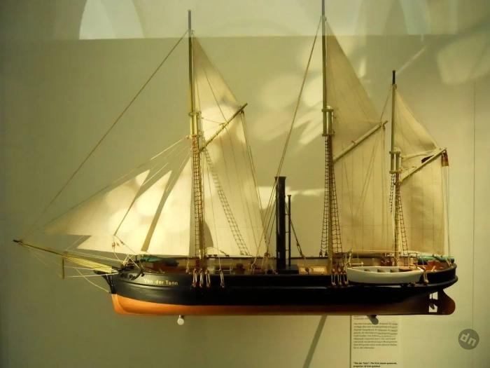 В 1848 году началась Первая война за Шлезвиг, в которой поучаствовал свежепостроенный флот герцогств, в котором самым современным кораблём была винтовая канонерская лодка «Фон дер Танн». Канонерка имела паровую машину мощностью, по разным данным, то ли 36 лошадиных сил (27 кВт), то ли 150 лошадиных сил (110 кВт). Судя по тому, что корабль с водоизмещением 120 тонн давал под парами 6 узлов, мне кажется более правдоподобным второе значение. Вооружение канонерки составляло 2х64-фунтовые пушки в носу и в корме, на вращающихся платформах, и 4х3-фунтовых гаубиц. Канонерка даже дала один бой датскому флоту, но в ходе оного села на мель и была сожжена экипажем. После войны датчане корабль подняли и после ремонта ввели в строй своего флота с названием «Сторен», но в 1862 году пустили на слом.