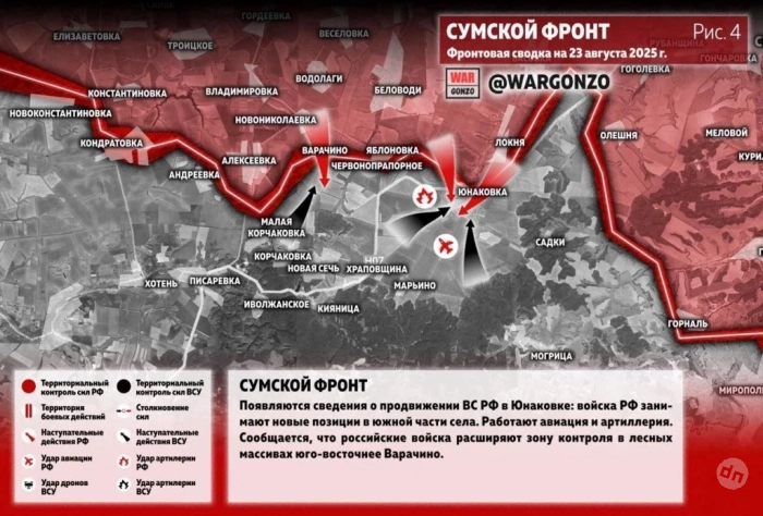 На Сумском направлении фиксируется продвижение ВС РФ в Юнаковке: войска РФ занимают новые позиции в южной части села. Работают авиация и артиллерия. Сообщается, что российские войска расширяют зону контроля в лесных массивах юго-восточнее Варачино.