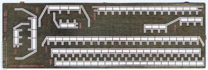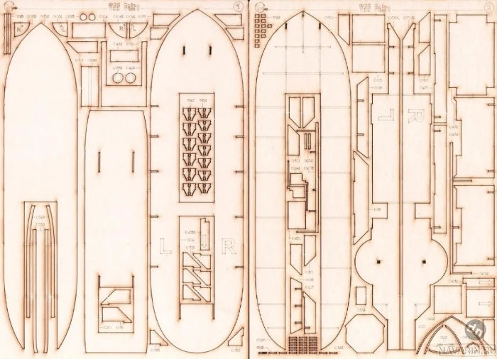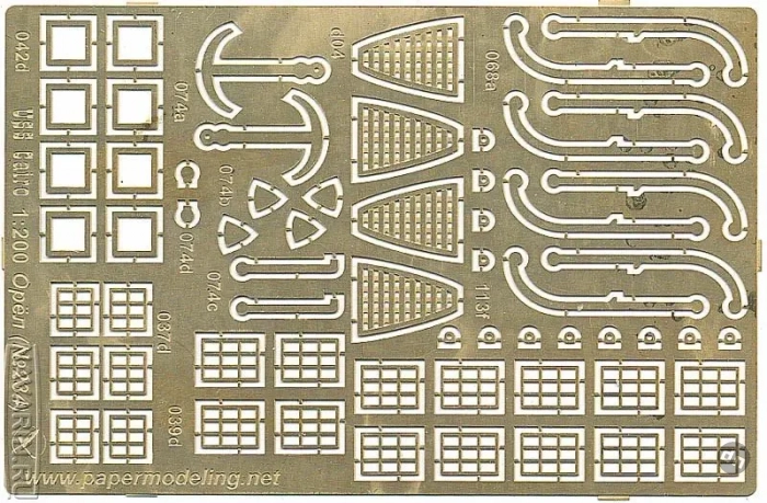 Таковыми, в принципе, были все бумажные модели прошлого века, разве что бумага на многих из них была довольно рыхлой. Зато сегодня такой бумаги в наборах уже нет. Мало того, появились производители, использующие современные технологии для изготовления дополнительных деталей бумажных моделей. Прежде всего, это комплекты лазерной резки. Обычно в этой технике делается «скелет судна» и его основные надстройки. Очень хорошо, что придумали еще и лазером не только вырезать детали моделей, но и гравировать палубы. Конечно, имея в руках бумажные палубы, вы всегда сможете наклеить на них «доски» из полосок шпона шириной 1,5–2 мм. Отдельные их неровности и шероховатости только лишь придадут вашей модели реализма, однако лазерная гравировка и очень красиво смотрится, и… экономит вам время на изготовление модели. Основной дополнительный материал для того же набора судна – шпангоуты и диаметральная плоскость – это картон: 0,5 мм, 1 мм и 1,5 мм. Добавляются к наборам сегодня и металлические детали «фототеч», полученные методом фототравления тонкого металла – обычно латуни.