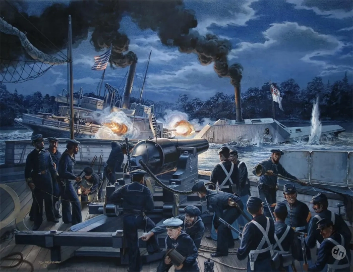 А вот так он воевал: «Артиллерийский расчёт военного корабля США «Майами» становится свидетелем того, как военный корабль Конфедерации «Албемарль» топит военный корабль США «Саутфилд», 19 апреля 1864 года». Картина художника Тома Фримена.