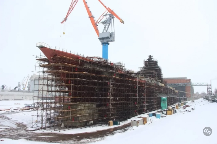 «Адмирал Нахимов» на верфи «Севмаш» в 2017 году, полностью разобранный и покрытый зелёно-красной грунтовкой