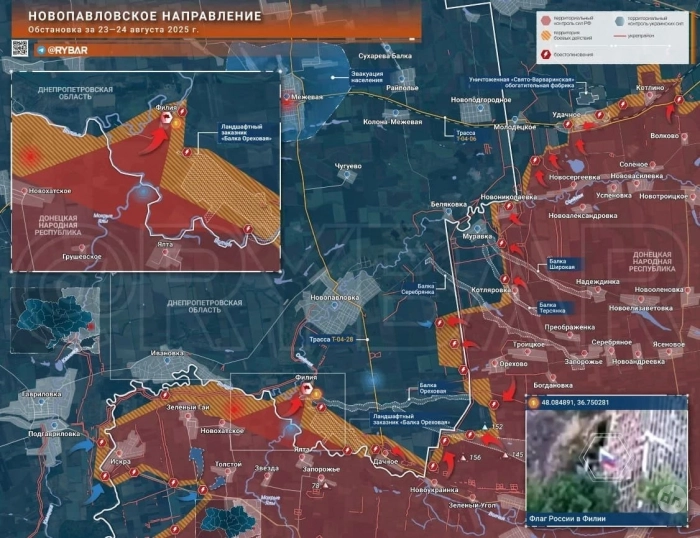 На Угледарском фронте ВС РФ пробиваются от Вороного к Камышевахе, срезая карман у последнего села. МО сообщило об освобождение Филии - это села на правом берегу реки Волчья в Днепропетровской обл. Ближайшая цель армии России - Новопавловка - крупный узел обороны и логистики ВСУ. До этого села 3 км, на подступах к нему идут бои.