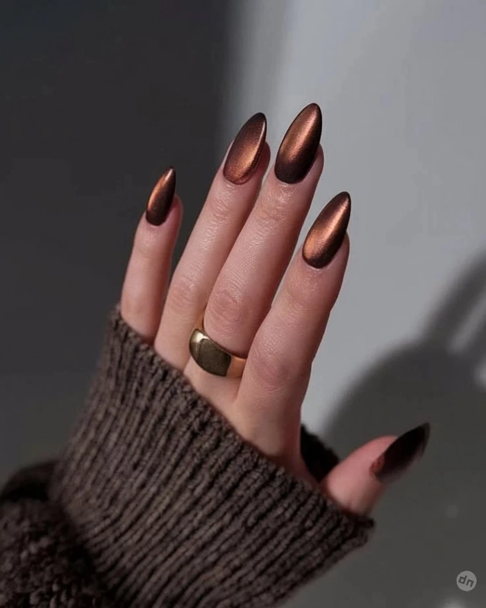 Коричневый в этом сезоне звучит по-новому: мерцающий, глубокий и благородный. Шоколадный шиммер не только добавляет тепла образу, но и смотрится дорого. А еще он невероятно практичен: сколы незаметны, а блеск делает ногти ухоженными.