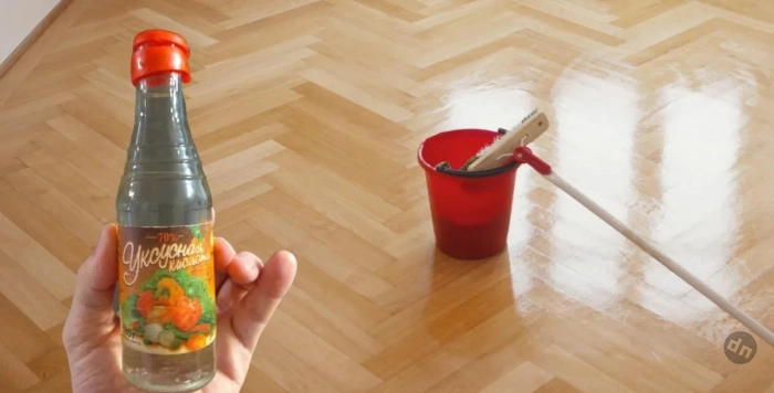 - В ведро тёплой воды добавьте 100–150 мл уксуса.