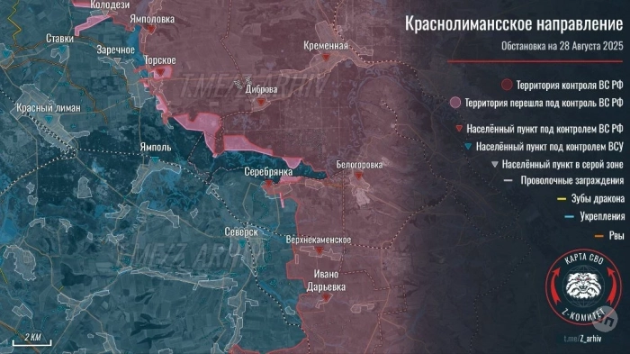 На Краснолиманском направлении активные бои идут в районе Карповки и Среднего. Ожесточённое сражение продолжается в Шандриголово, противник стягивает туда резервы из соседних сёл. В Колодезях противник удерживает ряд позиций в западной части села. В Заречном идут боестолкновения по всей территории посёлка. ВС РФ атакуют не только с юга и со стороны Торского, но и со стороны Ямполовки, сообщает Олег Царёв в своём Telegram-канале.