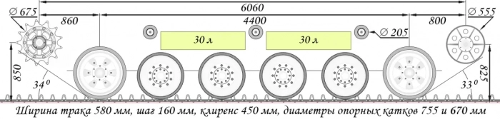 В качестве движителя отлично подойдёт гусеница 172.55.010сб-2 с повышенными ресурсом и сцепными свойствами, параллельными резинометаллическими шарнирами (РМШ), со штампованными траками, разработанная в ходе ОКР «Рамка-99» (БМПТ). Так как ТБМП будет значительно легче любого из двух основных танков, то разумная экономия веса должна только приветствоваться. В качестве первого и шестого опорных катков с каждого борта используем обычные опорные катки (не усиленные) от Т-90 диаметром 755 миллиметров и весом по 194 килограмма. На позициях 2-3-4-5 установим опорные катки от Т-80 диаметром 670 мм и весом по 120 кг. Столь необычное сочетание позволяет немного облегчить общий вес ходовой части и несколько снизить сопротивление качению гусеничного движителя в целом путём увеличения диаметра первых и последних опорных катков, как на английском танке «Валентайн».