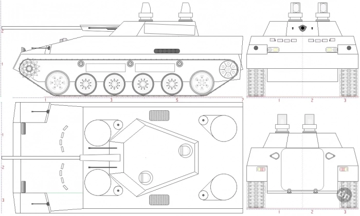 После согласования с железнодорожниками ширина отечественных основных танков увеличена по гусеницам до нулевой негабаритности, которая равна 3450 мм. Не упираясь в предельно допустимые параметры железных дорог, ограничимся выбором ширины тяжёлой БМП по гусеницам в 3400 миллиметров. Теоретически это позволит «упаковать» две машины в грузовую кабину транспортника Ил-76МД-90А. Одномоментно, чтобы не допустить роста периметра выше, чем у БМП-3, добровольно-принудительно сократим длину машины до 7 метров. Таким образом, по параметру удельного бронирования новая ТБМП уступит только последнему немецкому свежачку!