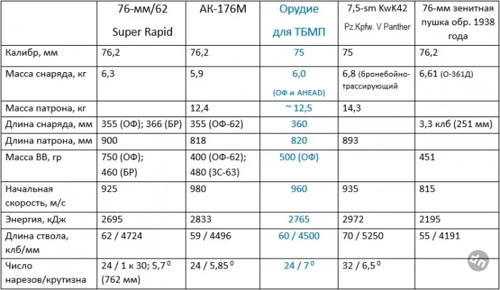 С лёгкой подачи политолога Соловьёва В.Р. стал популярен тезис о том, что надо воевать современным оружием, а не легендарным. Корабельные артиллерийские установки из таблицы вполне себе современны и востребованы флотами разных стран, в будущем могут получить и статус легендарных. А вот советская зенитная пушка и немецкий танк давно уже стали легендарными. В таблицу же они объединены как образцы вооружения калибра 75-76 миллиметров с выдающимися характеристиками для своего времени. И наша попытка создания орудия для ТБМП должна впитать всё лучшее из мирового опыта.