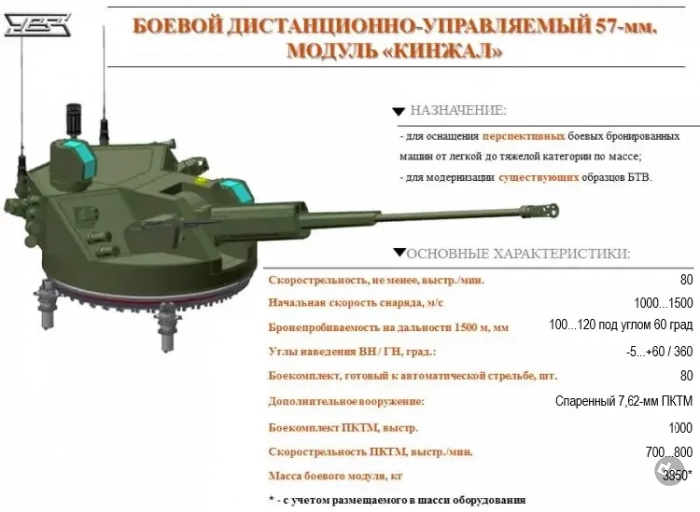 Скоростные характеристики машины, которые будут сопоставимы со столь популярными сейчас не от хорошей жизни мотоциклами, квадрациклами и багги, в сочетании с броневой защитой, обеспечиваемой 35 тоннами металла, и огневой мощью на уровне лёгкого танка, в сочетании с непревзойдённой проходимостью обеспечат штурмовым подразделениям глубину и внезапность прорывов вражеской обороны с наименьшими потерями. В-третьих, именно благодаря компактности и мощности нового двигателя становится возможным создать боевую машину пехоты, способную обеспечить степень защиты экипажа и десанта на уровне лучших аналогов вероятного противника и оснастить её комплексом вооружения, способным противостоять всем существующим видам вооружения на современном поле боя.