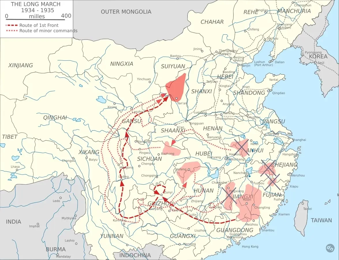 До 1934 года коммунистам удалось отбить 4 карательных похода войск Чан Кайши. Наконец, весной 1934 года армия Гоминьдана с целью нанести последний и решающий удар направилась к столице непризнанной республики – городу Жуйцзинь. Лидеры коммунистов во главе с Мао Цзэдуном приняли решение пробиваться на север, где они могли надеяться на помощь от СССР. Сдерживать удары вражеских войск остались 16 тысяч солдат китайской Красной Армии, а 80 тысяч в ночь на 10 октября 1934 года выступили в знаменитый Великий (Долгий, Северо-Западный) поход. Он продолжался год и четыре дня, к декабрю китайские красноармейцы с боями прошли 500 км труднейших горных дорог, преодолев четыре «линии обороны», последняя из которых была оборудована под руководством германских военных инженеров.