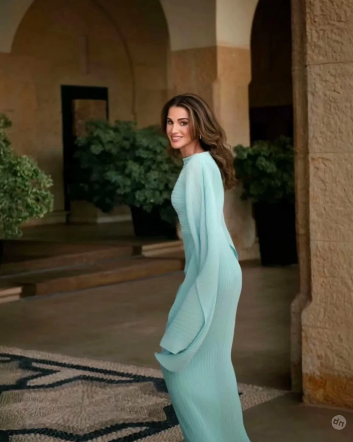 На первом снимке Рания запечатлена в бирюзовом макси-платье с длинными рукавами.