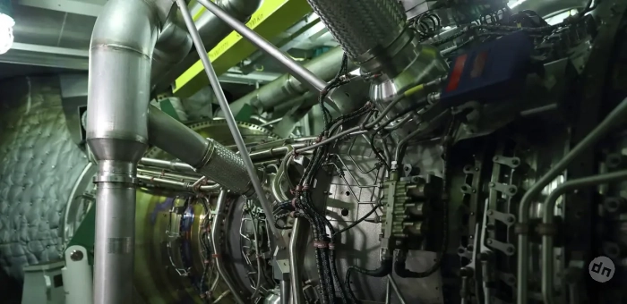 На этом снимке «живой» газотурбинный двигатель на основе турбины МТ30 авианосца HMS Prince of Wales. ГТД включает в себя корпус и вспомогательное оборудование, и в сборе весит около 30 тонн. В виде единого узла вместе с опорным фундаментом он может быть установлен с помощью одного подъемника (желтая рельса вверху)