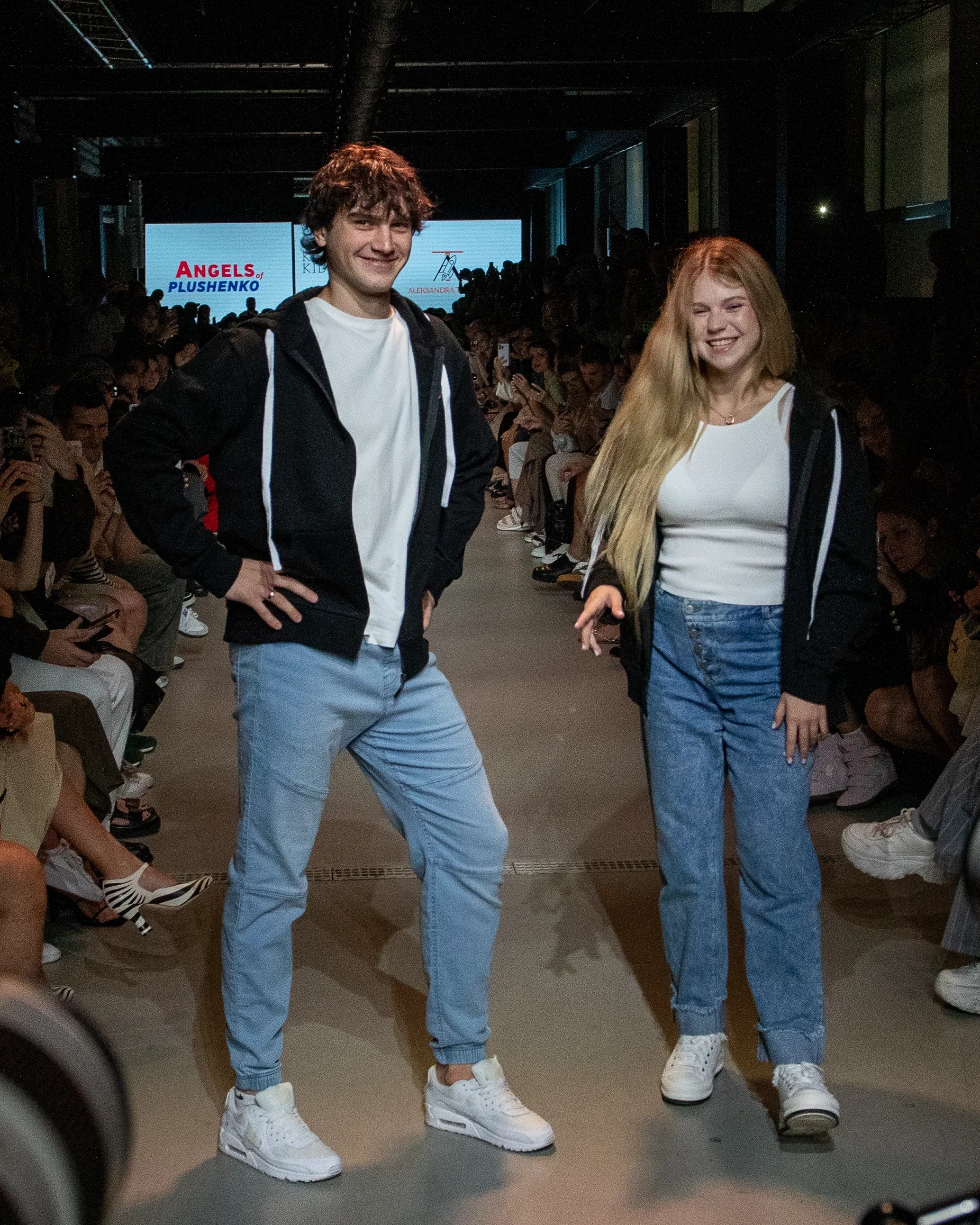 Молодая мама с улыбкой на лице вышла на подиум в самом финале показа. Она представила образ с голубыми джинсами, белой майкой и толстовкой. Муж Александры шёл позади неё в таком же, парном образе.
