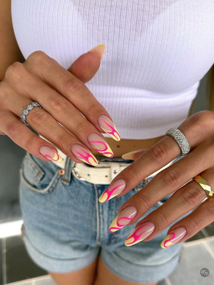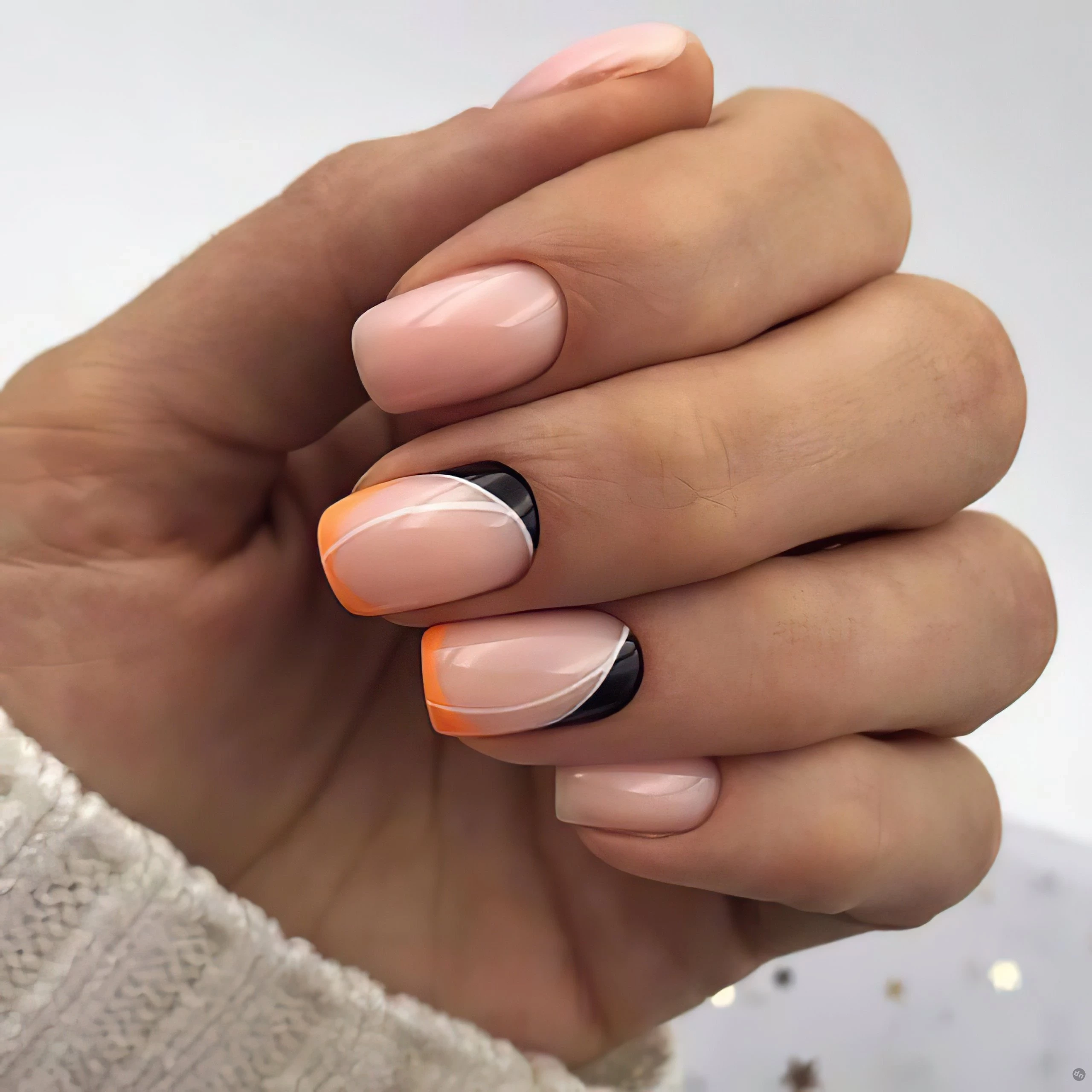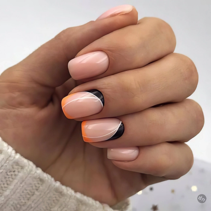 Этот классический френч с нюдовым фоном получает новое воплощение благодаря абстрактным элементам. Добавьте игривости своему образу с помощью мягких волн или ярких полосок, сохраняя при этом минимализм и тонкость.