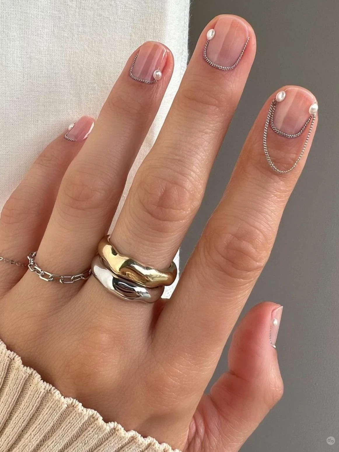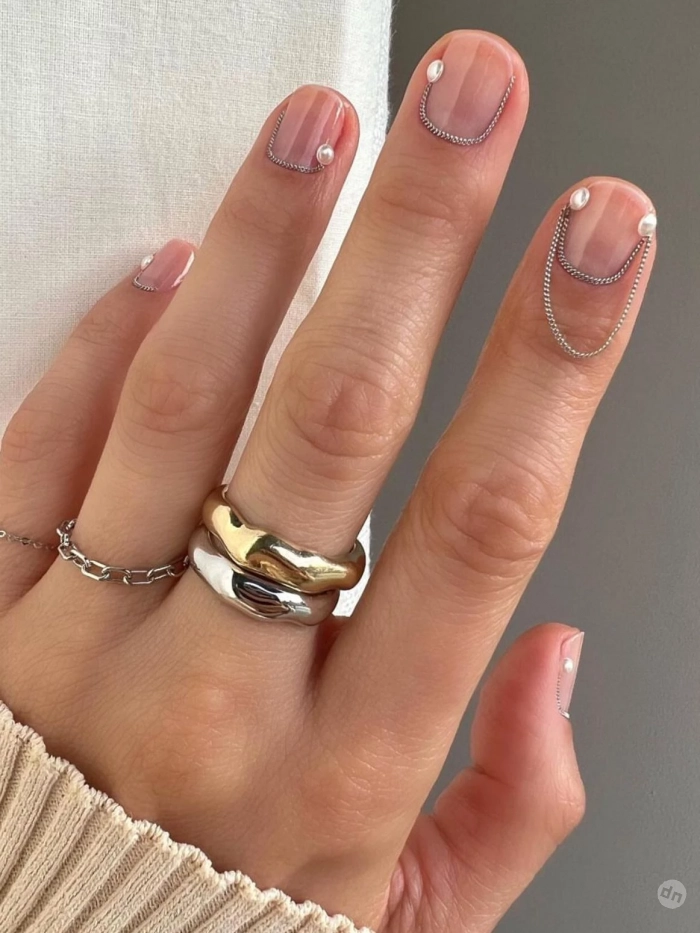 Смелое решение для тех, кто ищет нечто уникальное — нюдовая база с деликатными цепями или цепочками по краям ногтей. Этот дизайн добавляет акценты гранжа и женственности одновременно, особенно если украсить цепочки маленькими стразами или жемчужинами.