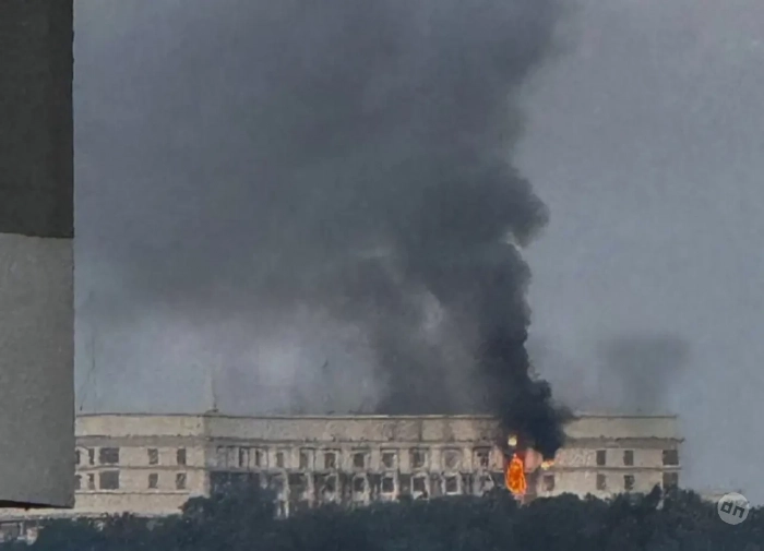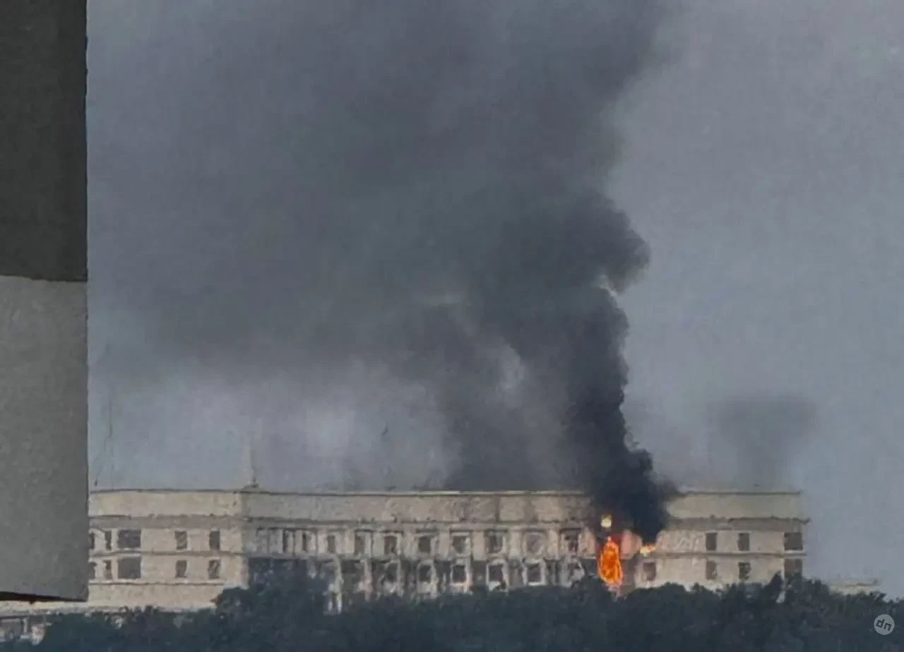 Очаг пожара находится на 9-м этаже. При этом пламя активно распространяется, охватывая и верхний этаж правительственного здания.
