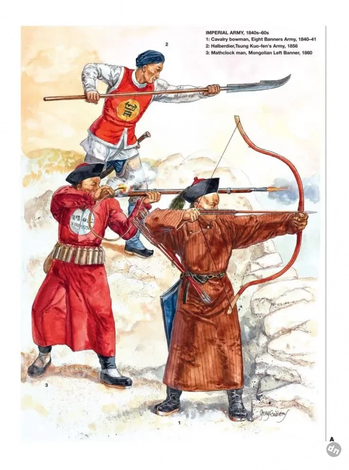 В целом китайская военная организация застряла на уровне XVII века, когда маньчжуры покорили Китай. «Восьмизнамённая армия» неплохо смотрелась бы на полях Тридцатилетней войны, но в XIX веке была жутким анахронизмом! Самым элитным из «восьми знамён» считался корпус «Жёлтого с красной каймой знамени». В него, помимо всех прочих, входил сам император и вся императорская фамилия. Структура восьмизнамённой армии была по-восточному вычурной и непонятной. В неё входила дворцовая стража «Цзинь-цзюнь-ин», стража летней резиденции «Юань-мин-юань», стража императорской усыпальницы — «Шао-лин-цзы-бин» и даже «Тигровая рота» — «Ху-цянь-ин», куда входили лучшие стрелки из лука для императорской охоты. Был и экзотический отряд «тигров» — щитоносцев с саблями, одетых «под тигров» в жёлтые с полосками костюмы, считалось, что вражеские лошади, увидев тигров, испугаются и убегут. В Англии тигров не водилось, так что английские лошади этих бойцов не боялись.
