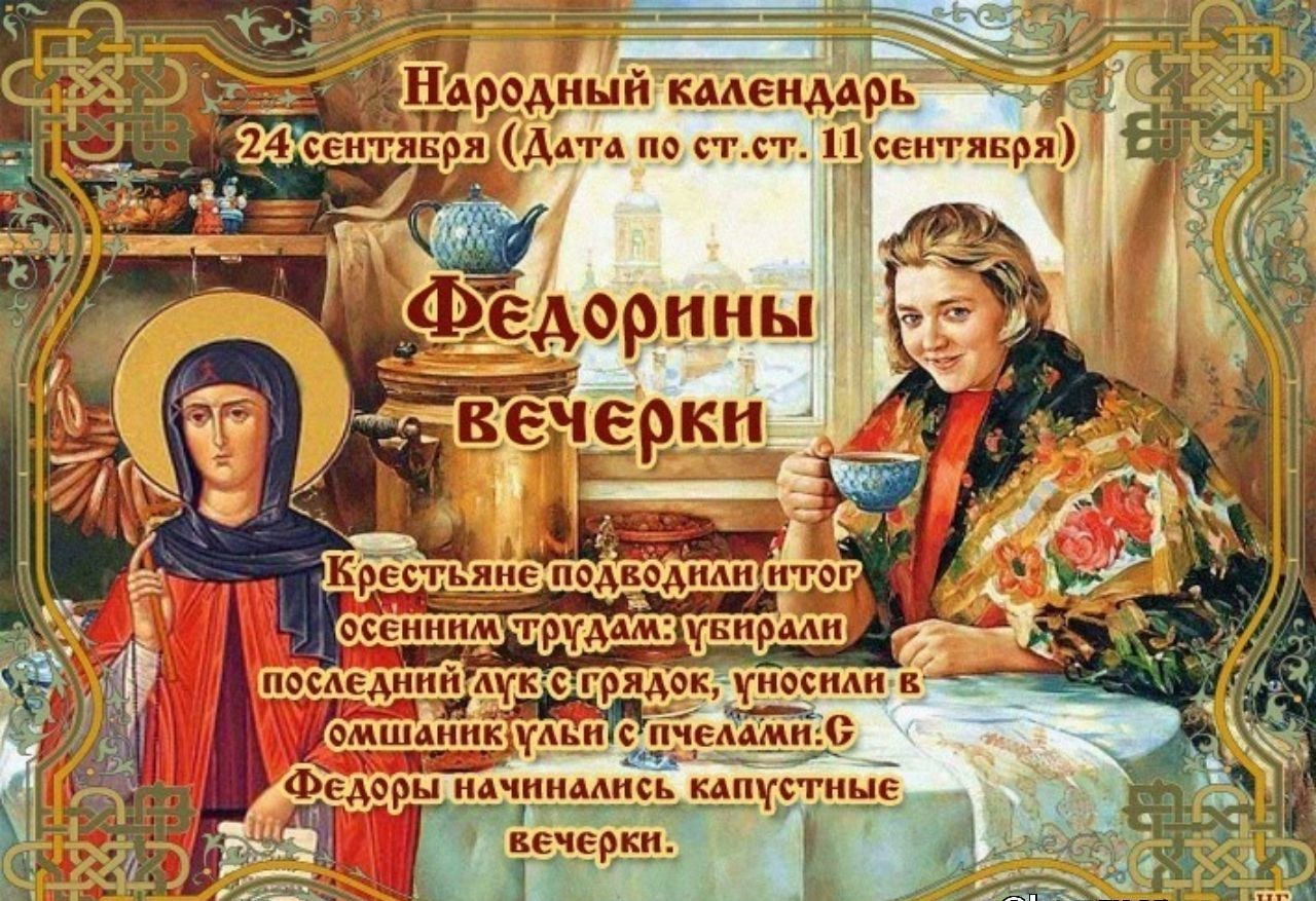Федорины вечерки, отмечаемые 24 сентября, связаны с памятью преподобной Феодоры Александрийской младшей и наполнены традициями и обрядами, которые передавались из поколения в поколение. В этот день предки старались не оставаться без дела, ведь уборка урожая завершалась, и начиналась подготовка к зиме.
