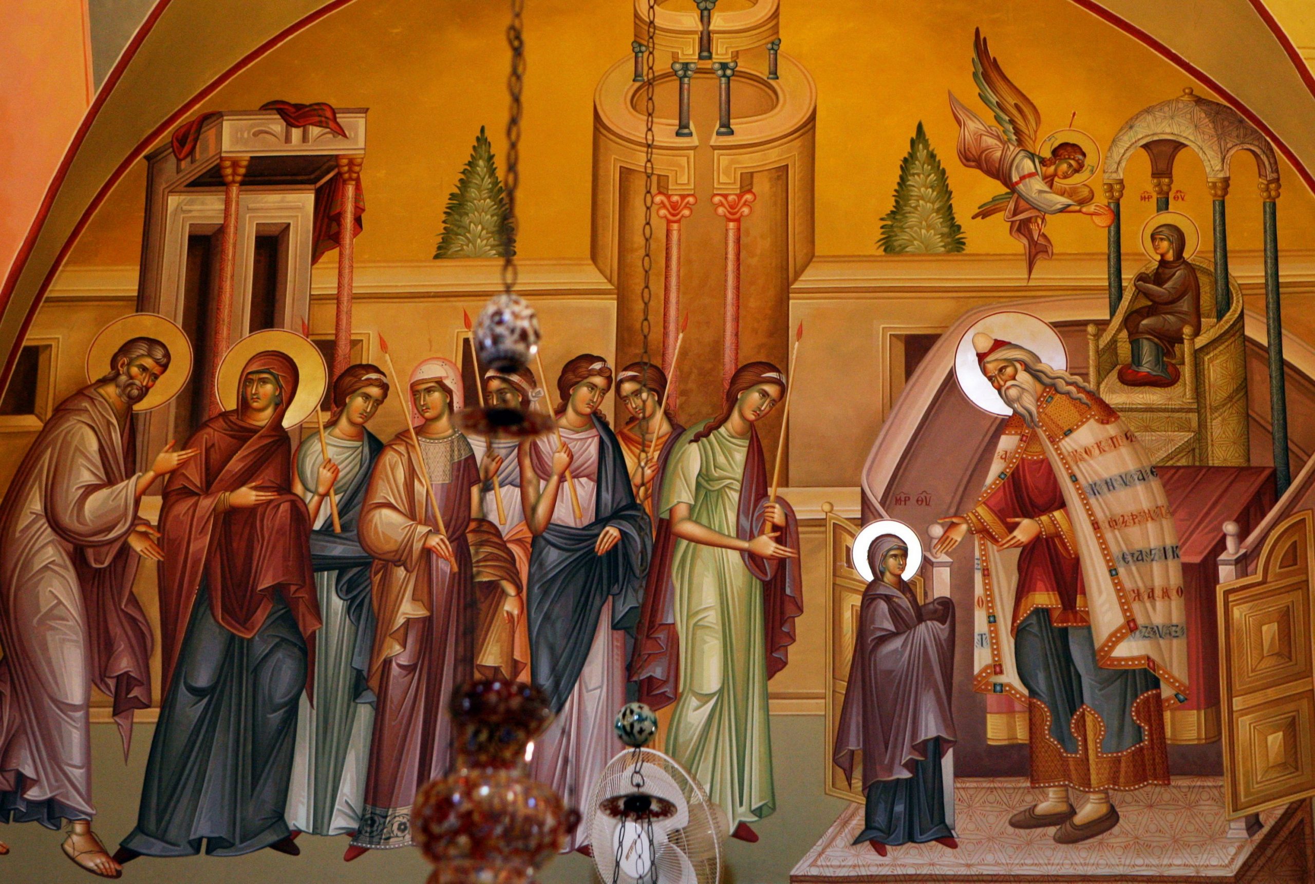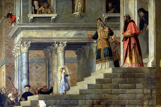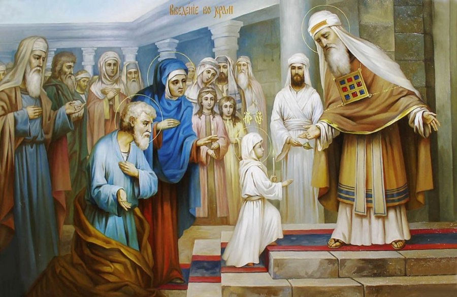 Торжественный день отправления Марии в Храм стал настоящим событием. С молитвами, горящими свечами и гимнами её сопровождали родные и близкие. На пороге Иерусалимского храма Пресвятую Деву встречал первосвященник Захария. Нарушая все традиции, он провел юную Марию через пятнадцать ступеней прямо в Святое Святых — место, недоступное для обычных людей.