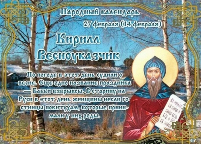 27 февраля, в день Кирилла Весноуказчика, народные приметы говорят о переменах в погоде и предвестниках будущих событий. Ясная погода в этот день – знак того, что в начале марта нас ждут морозы. Если же ветер холодный, а небо затянуто облаками, осень наступит раньше, чем обычно.